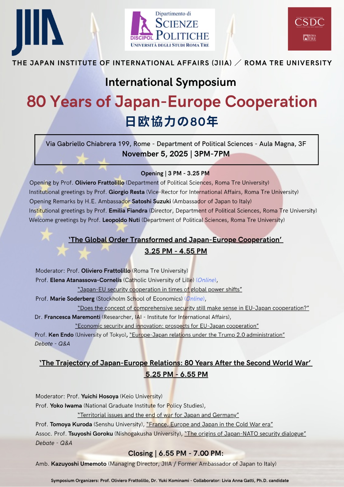 Il Japan Institute of International Affairs (JIIA) e il Dipartimento di Scienze Politiche dell’Università degli Studi Roma Tre, in collaborazione con il Centro Studi sulla Cina e sull’Asia Orientale (CSDC), organizzano il Simposio internazionale “80 Years of Japan-Europe Cooperation”, che si terrà il 5 novembre 2025, dalle 15:00 alle 19:00, presso l’Aula Magna (3° Piano) del Dipartimento di Scienze Politiche (Via Gabriello Chiabrera 199, Roma).