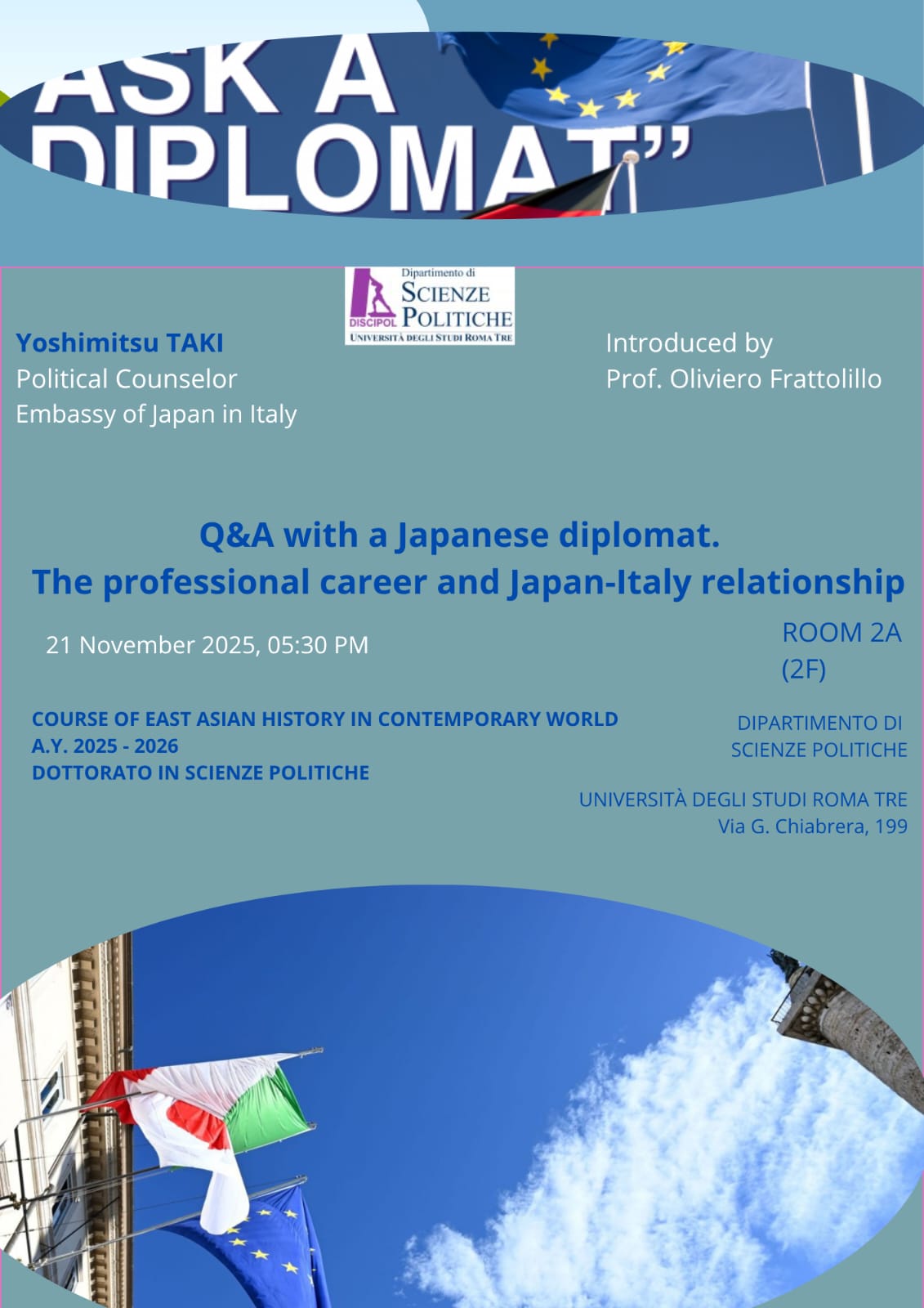 Novembre 15, 2025 Q&A with a Japanese Diplomat. The Professional Career and Japan-Italy Relationship HomePolitics and Law General EventsQ&A with a Japanese Diplomat. The Professional Career and Japan-Italy Relationship